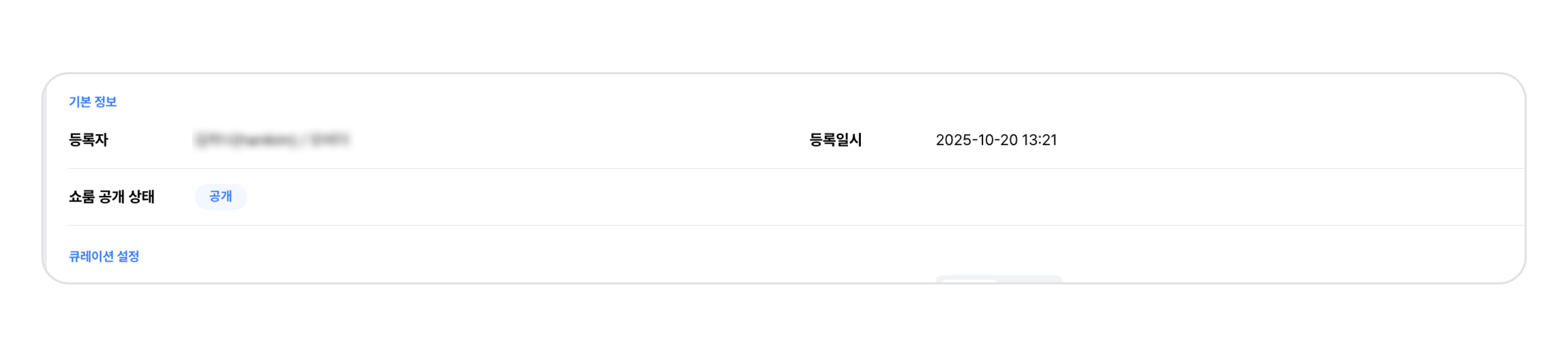 ๊ธฐ๋ณธ ์ ๋ณด ์์ญ์์๋ ๋ฑ๋ก์, ๋ฑ๋ก์ผ์, ์ผ๋ฃธ ๊ณต๊ฐ ์ํ๋ฅผ ํ์ธํ ์ ์์ต๋๋ค.