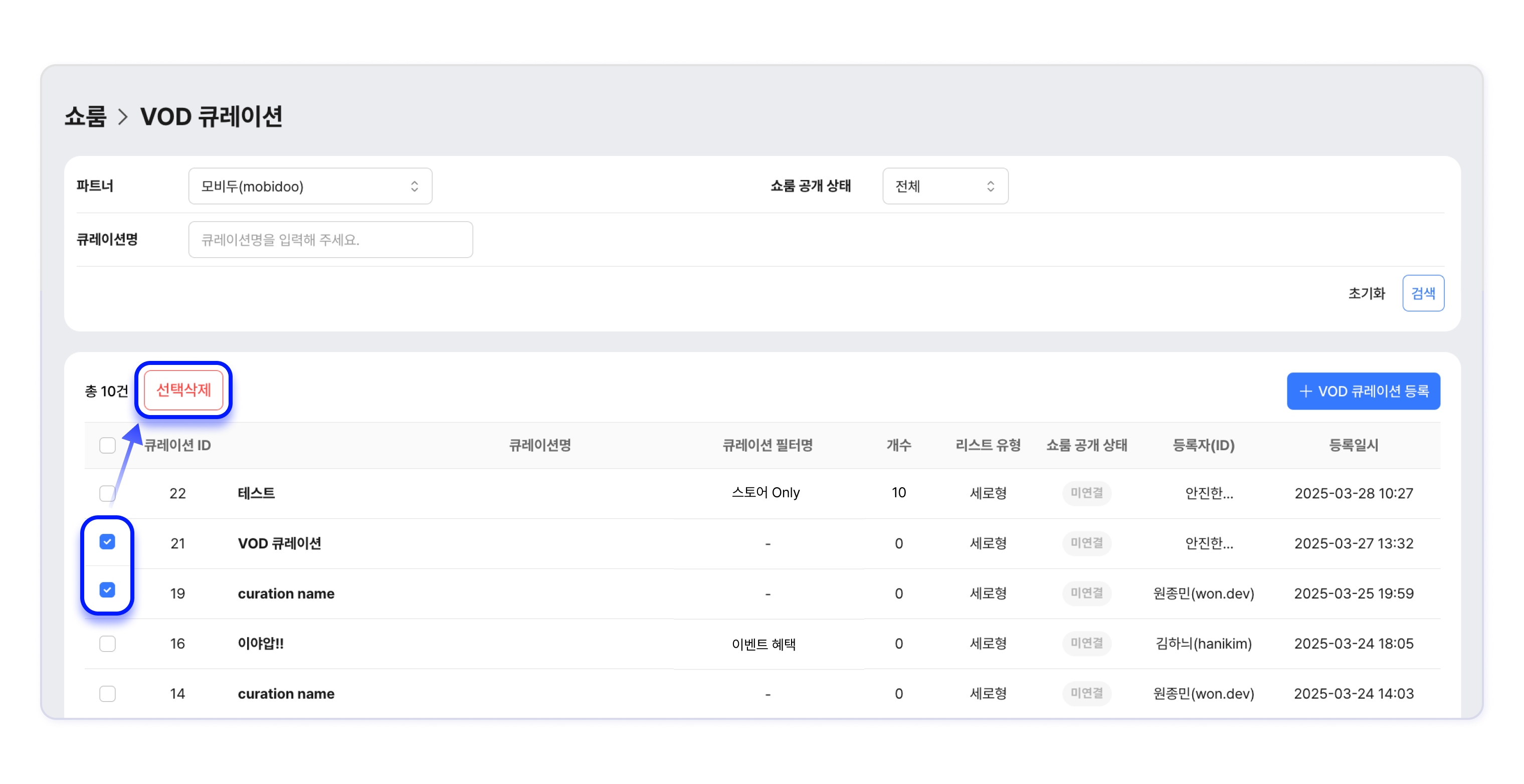 STEP 1. ๋ชฉ๋ก์์ ์ญ์ ํ VOD ์ฝํ ์ธ ๋ฅผ ์ ํ(โ๏ธ)ํฉ๋๋ค.